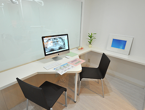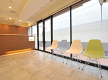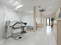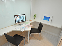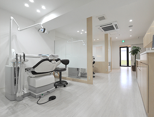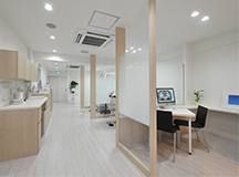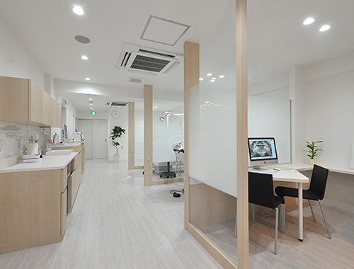 診療スペースは、清涼感のある明るく爽やかなイメージに。 ガラススクリーンで間仕切ることで、開放感のある空間に仕上がりました。