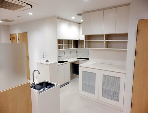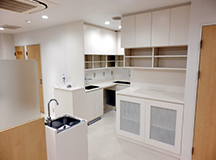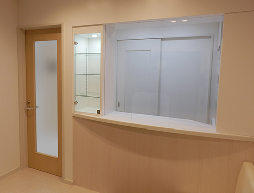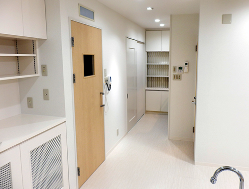 限られたスペースに、消毒・準備・印象コーナーを確保。 明るくシンプルな内装とすることで、広く感じられる空間となりました。